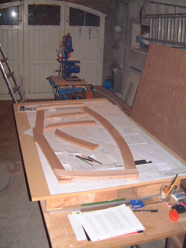 Je me suis attaqué à la réalisation des couples et à leur assemblage dans mon garage et petit atelier au rez-de-chaussée de ma maison. Après report du dessin des couples ( à l’échelle mais sur deux feuilles de plan) sur un panneau de médium, puis transcription de chaque élément de couple sur des bandes cartonnées j’ai attaqué leur découpe dans le bois avec ma petite scie à ruban. Une fois tout découpé j’ai réalisé les assemblages à la colle époxy.