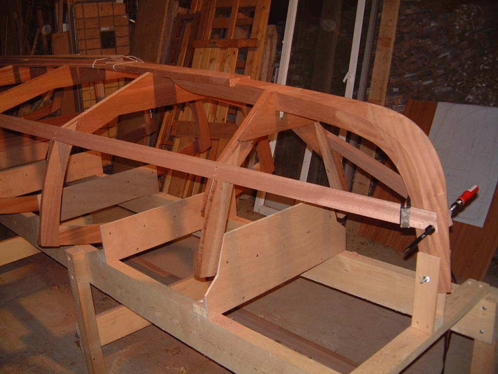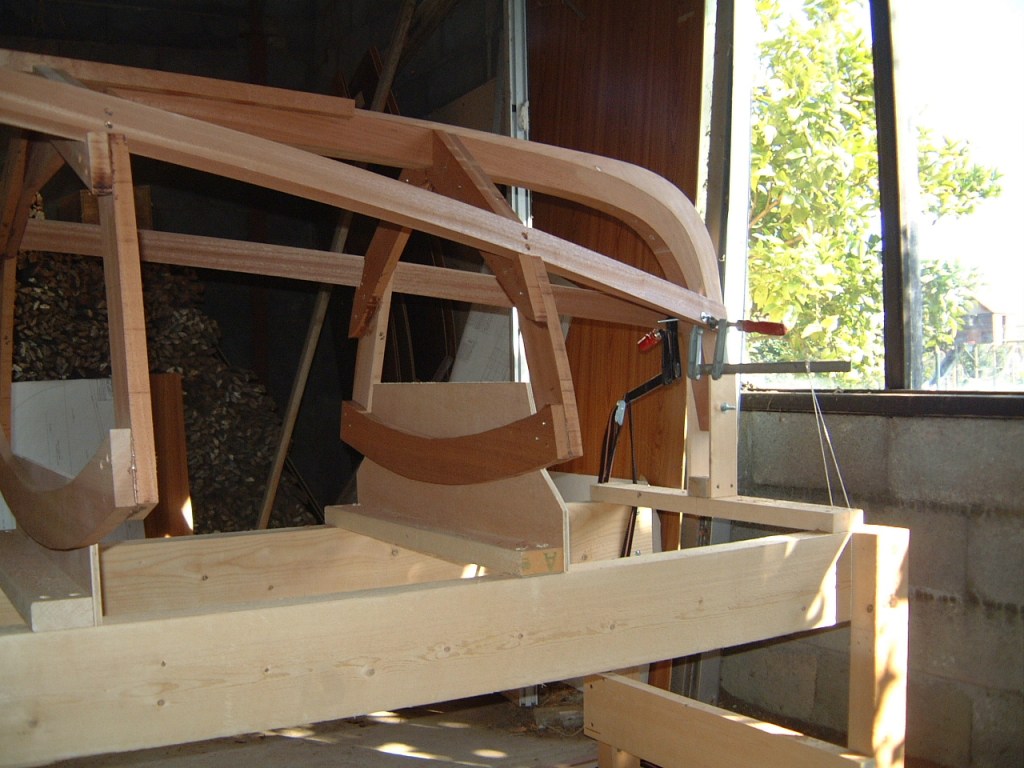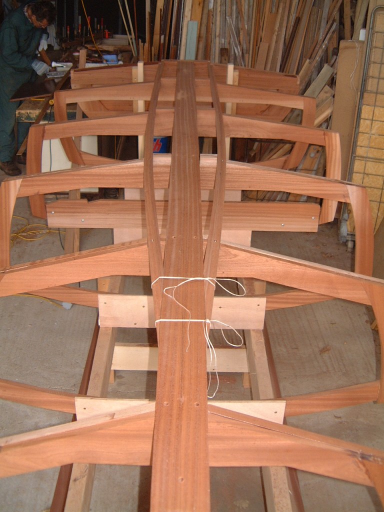 Bien que d’une section assez conséquente, la quille n’a pas été trop difficile à mettre en place et à ajuster car elle ne présentait qu’une faible courbure. Il n’en a pas été de même avec la serre de bouchain qui bien que d’une section plus faible demandait à être fortement vrillée pour trouver sa place sur les couples. Après l’avoir bloqué à une extrémité, je fixais un serre joint à son autre extrémité; celui-ci me servait de bras de levier pour la mettre en torsion. Une fois sous tension je la chauffais avec un pistolet à décaper et je la maintenais ainsi pendant une nuit pour recommencer le lendemain jusqu’à ce qu’elle conserve la courbure voulue sans tension. L’utilisation d’une étuve aurait surement permis de faire cette mise en forme de façon plus simple et avec moins d’effort mais je n’avais le matériel approprié. Après avoir assuré et ajusté les découpes appropriées dans les couples et l’étrave, quille et serre ont été fixés par collage époxy et vissage. Deux lattes supplémentaires ont été ajustée à la quille pour former ce qui sera le fond du bateau.