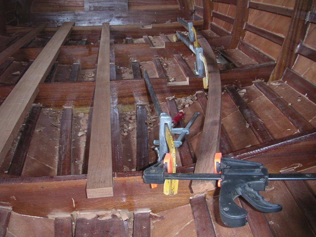 Les supports de plancher ont posé encore quelques problèmes du fait le la courbure importante des deux éléments latéraux. L’habillage en contreplaqué a lui demandé un peu de temps pour la réalisation des découpes afin que l’ensemble s’ajuste et s’encastre parfaitement.