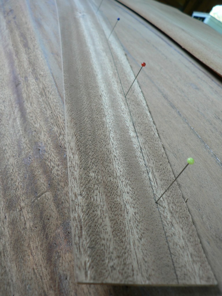Le bordé et une partie du fond va être plaqué en acajou de 2mm. Mon objectif étant d’avoir un aspect final aussi proche de celui d’un bateau avec des bordés en bois massif, j’ai traité ce plaquage par grandes lames longitudinales (comme pour la deuxième couche de contreplaqué). La découpe de ces lames de placage sous forme de bordage a demandé pas mal d’astuce, de minutie et de patience afin que celles-ci soient parfaitement jointives et aient une forme cohérente de la proue à la poupe. Leur collage, comme pour l’ensemble de la construction, s’est fait avec de la résine époxy. Pour les maintenir et pour les appliquer parfaitement sur le contreplaqué pendant la prise de la résine elles ont été agrafées au travers de morceaux de cagettes. Cela permettait ensuite en enlevant le bois à cagette d’avoir des têtes d’agrafe apparentes et donc de pouvoir les saisir pour les arracher avec une tenaille. Ce travail a été quelque peu long et fastidieux mais il a permis de n’avoir aucun élément de fixation apparent et donc de n’avoir aucun élément métallique susceptible de rouiller par la suite. A la fin de cette opération un nouveau retournement du bateau a été réalisé pour finir le bordé.