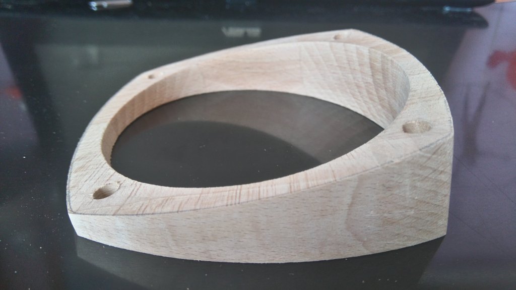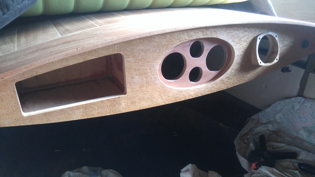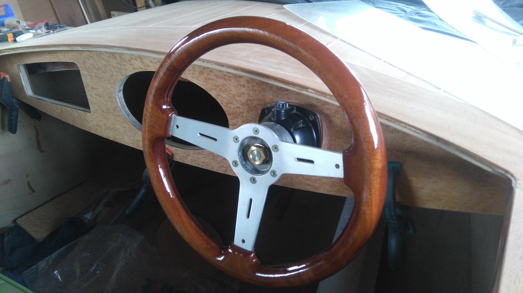 La structure principale du tableau de bord était en place, restait à assurer sa finition. Je l’ai mis en valeur en réalisant un placage en érable moucheté afin d’assurer un léger contraste avec l’acajou de l’ensemble. Les compteurs sont venu s’insérer dans la partie centrale, ovale et en léger retrait. J’ai choisi des compteurs à fond blanc avec un entourage chromé assez fin et ai peint en noir leur support pour mieux les faires ressortir. L’ouverture de la boite à gant a été fermée par une porte plaqué aussi en érable avec un bouton d’ouverture bricolé avec un petit reste de tube de chrome. Un autre élément travaillé a été le support du volant afin de lui donner une inclinaison plus esthétique et plus confortable à l’usage. Le rendu, après vernis, a été à la hauteur de ce que j’espérais.
